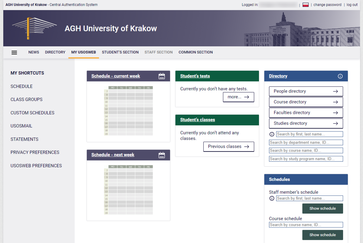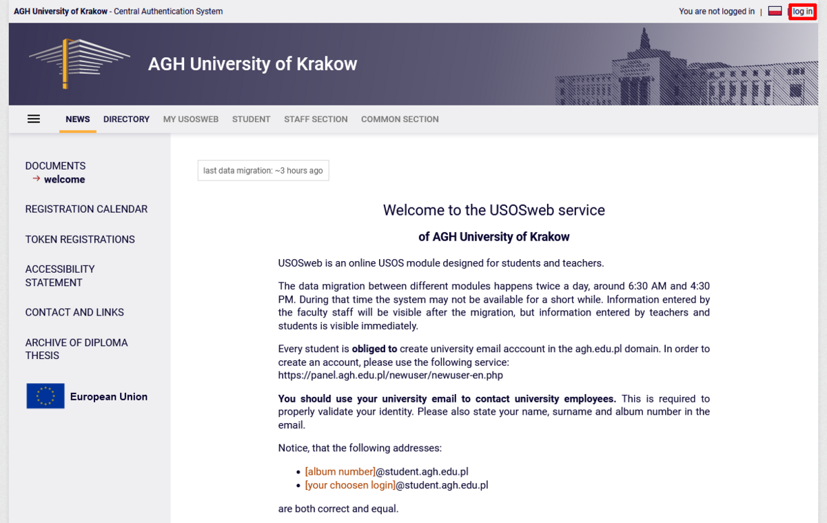 The USOS system sign-in uses the AGH SSO authorisation, which provides access to many other services, such as: UPeL, Microsoft 365, AGH Cloud and Overleaf.
