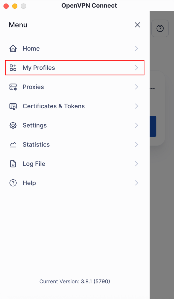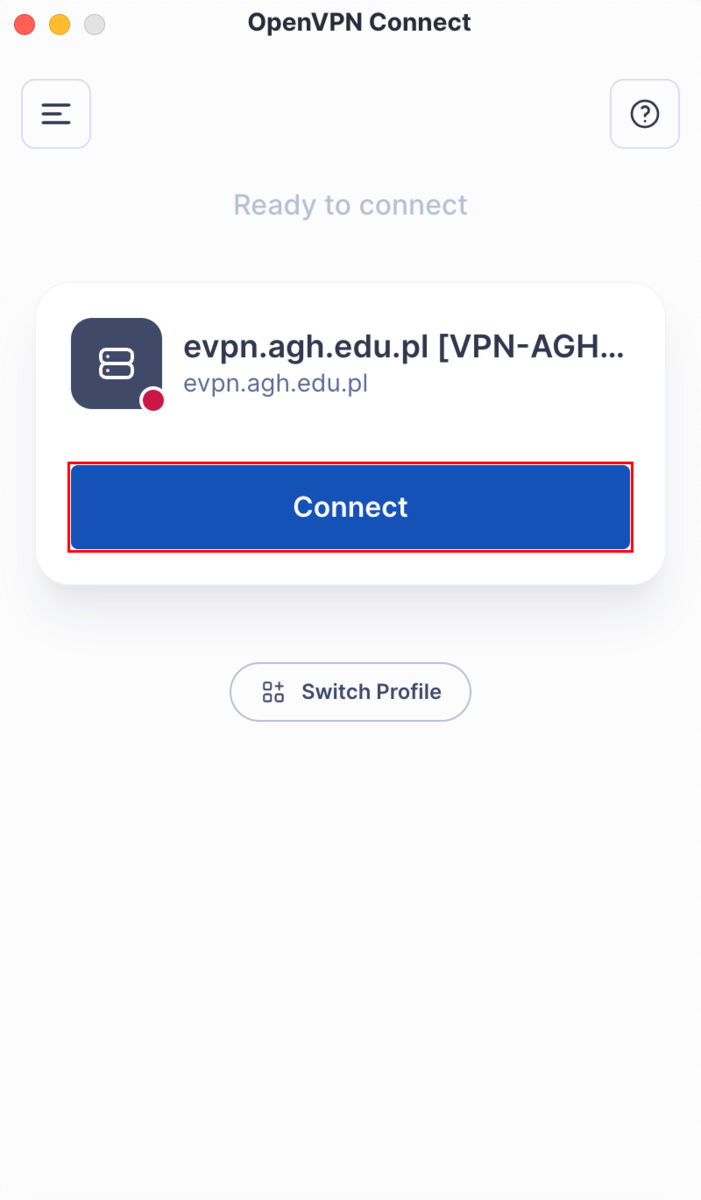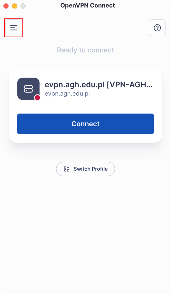 Uruchom program OpenVPN i naciśnij przycisk menu znajdujący się w lewym górnym rogu okna.