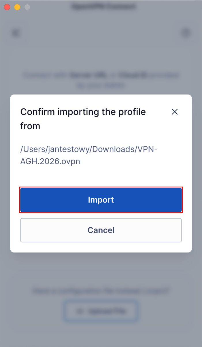 Wybierz pobraną wcześniej konfigurację połączenia VPN, a następnie kliknij "Otwórz".