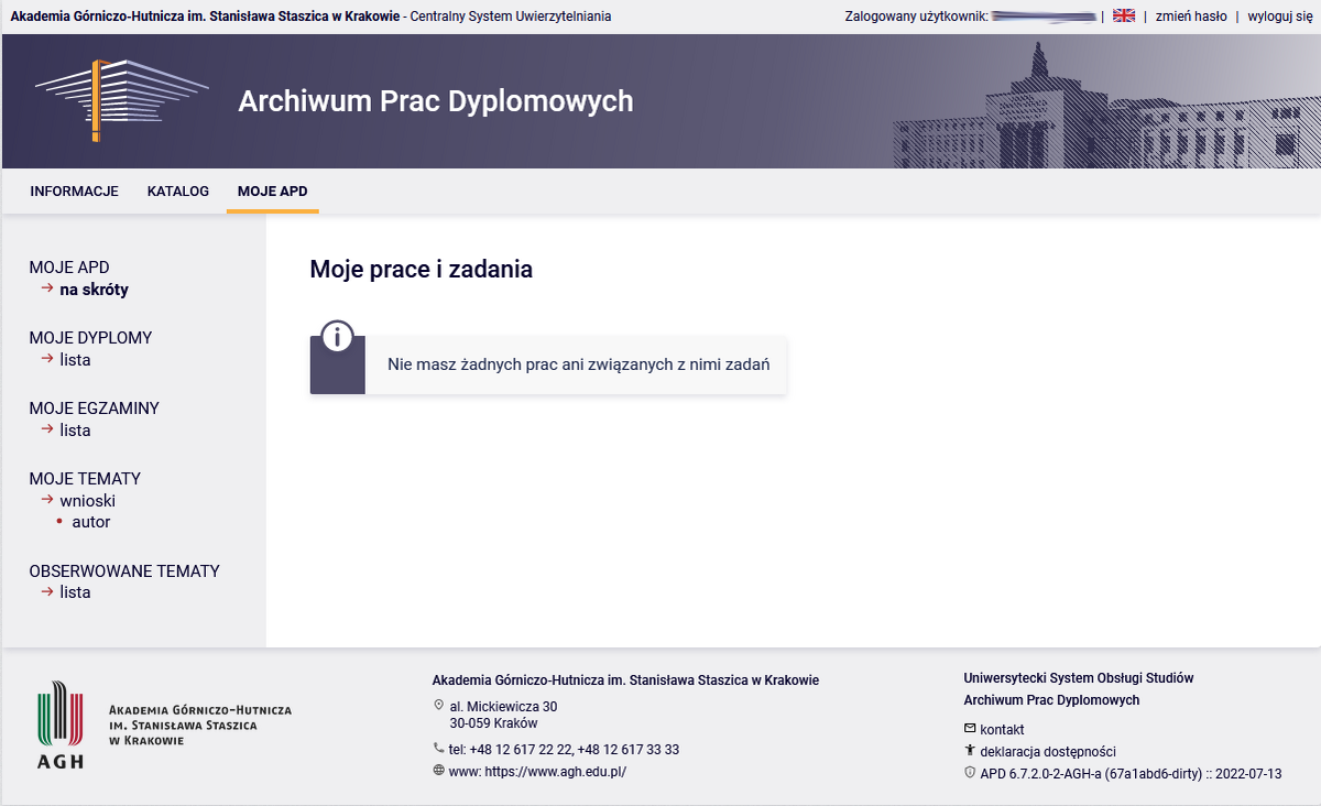 Zalogowanie do APD jest możliwe przez SSO AGH, które pozwala na dostęp do wielu usług Uczelni takich jak: UPeL, Office 365, Chmura AGH, czy Overleaf.