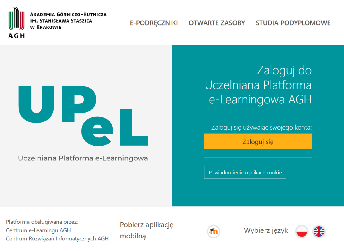 Zalogowanie do UPeL jest możliwe przez SSO AGH, które pozwala na dostęp do wielu usług Uczelni takich jak: USOS, Office 365, Chmura AGH, czy Overleaf.