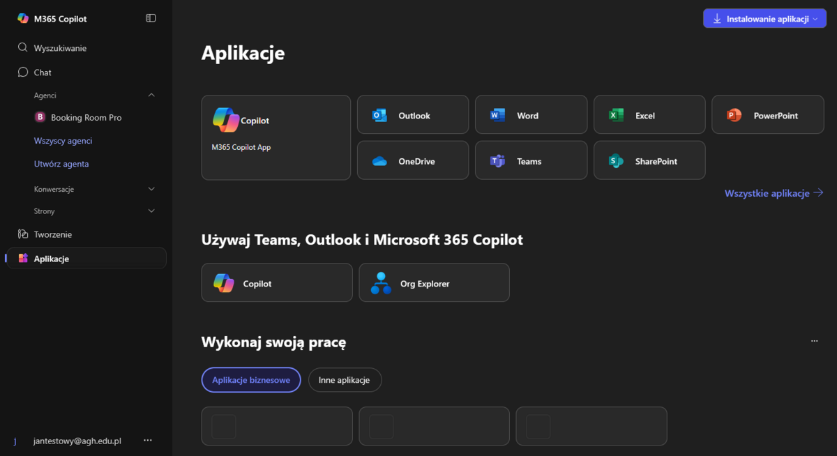 Aktywacja licencji nie jest konieczna w przypadku chęci korzystania z pakietu Microsoft 365 Copilot w wersji online, jednakże po aktywacji następuje przypisanie licencji do Użytkownika, co skutkuje również zwiększeniem funkcjonalności narzędzi webowych. Szczegóły dotyczące aktywacji licencji dostępne są w instrukcji: Instalacja aplikacji Microsoft 365.
